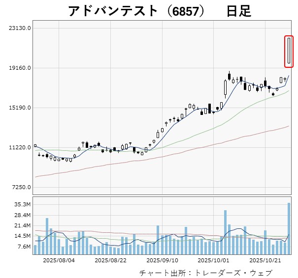 2025年10月29日の東京市場で、半導体大手のアドバンテスト(6857)がストップ高(前日比4000円高、+22.1%)まで上昇しました。