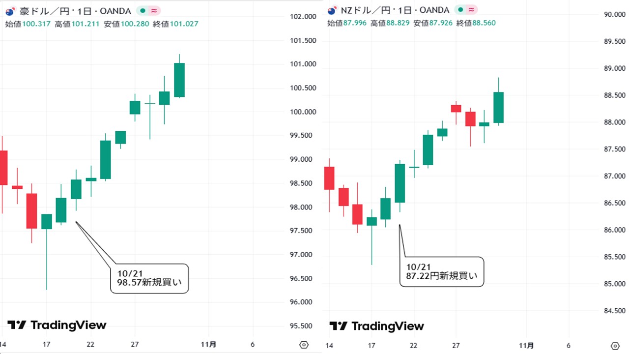 現在レートで豪ドル円98.57円、NZドル円87.22円で買い(ストップは97.80円、86.80円)。利確候補は買値から1-2円上。