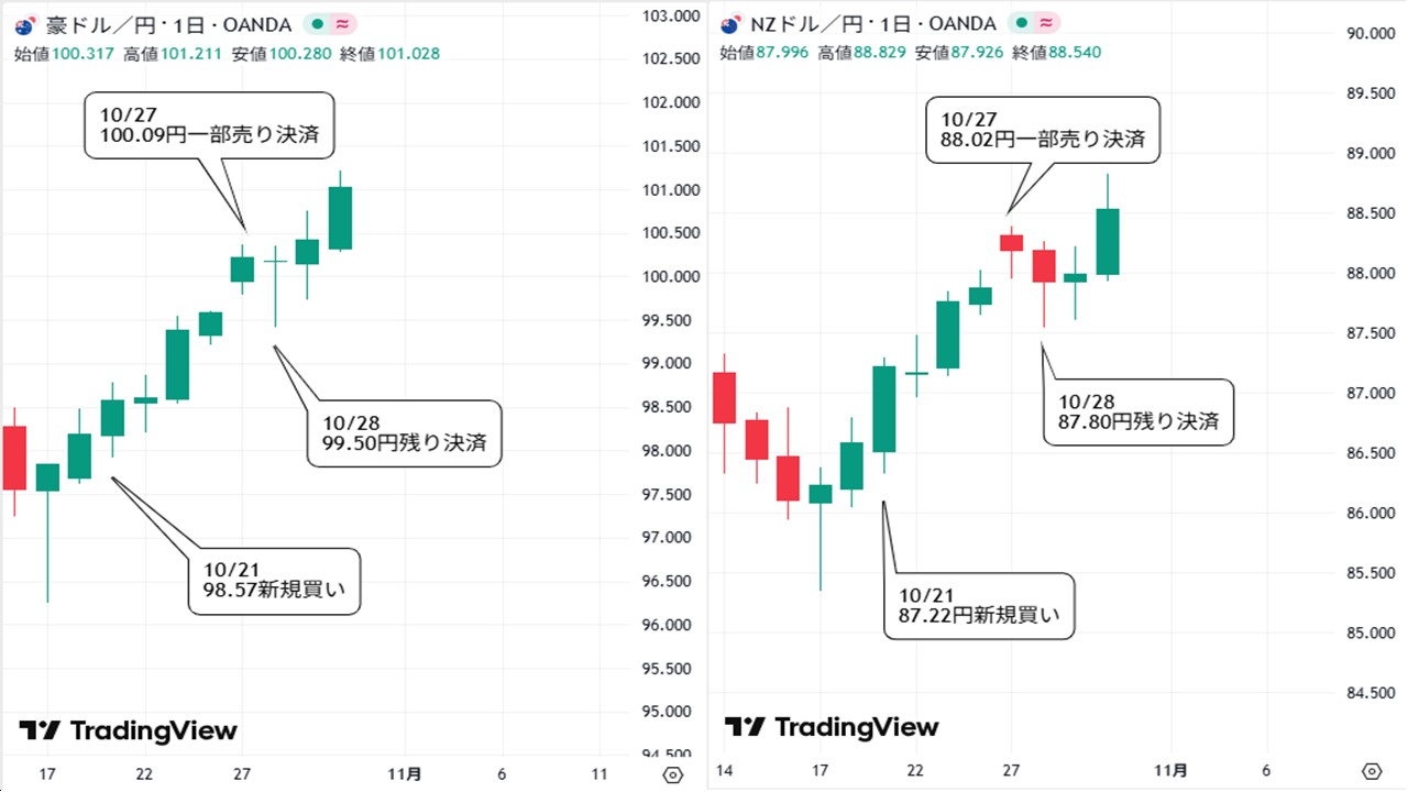 ドル円が下方向に動きそうな気配を感じたので、既に買いポジションを持っている豪ドル円とNZドル円についても、目標値には若干届いていないものの、一部ポジションは利益確定することとしました。