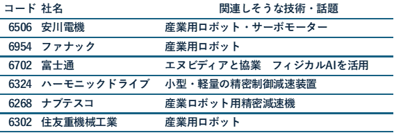 ロボット製造においても同じようなことが言えるので、今後欠かせない存在となり得る銘柄を探してみると面白いかもしれません。上の銘柄はフィジカルAIがテーマとなりそうな銘柄の一例です。おそらく探せばたくさんあると思いますので、ぜひ自分の推しを探してみてください。