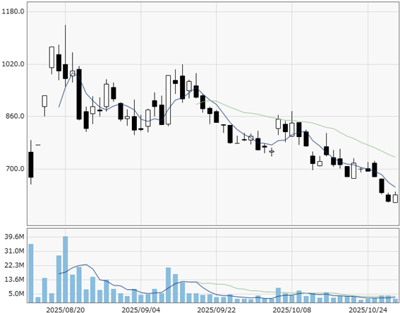 この決算を受けた翌営業日(16日)の株価は買いで反応。811円まで上値を伸ばしたものの、その後は売りに押され終値は744円となりました。その後は、下値を切り下げる展開となり、とうとう600円台まで下落。10月28日には安値で597円まで下落し、これが現時点(2025年10月30日)での上場来安値となっています。