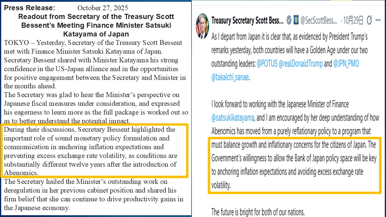 会談の中で、ベッセント長官は、アベノミクス導入から12年が経過し、状況は大きく変化していることから、インフレ期待を安定させ、為替レートの過度な変動を防ぐ上で、健全な金融政策の策定とコミュニケーションが果たす重要な役割を強調しました。