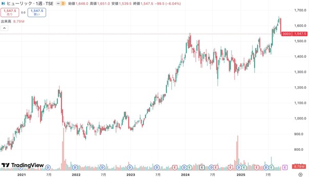 しかし、その好調な業績とは裏腹に、株価は2024年以降、1,300円台から1,600円台のレンジで一進一退の動きが続き、上値の重い展開となっています。