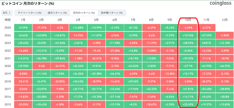 暗号資産分析サイトcoinglassによれば、BTCドルは過去10年、10月にマイナスを記録したのは2018年の1度だけでした。そのため一部の市場参加者の間では、10月のOctoberをもじって「Uptober」と言われていたようです。