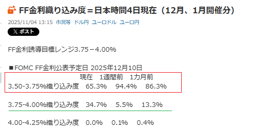 短期金利の先物市場では、依然として12月FOMC利下げを見込む向きは多いです。しかしながら、一時は完全に市場が織り込んでいた利下げに対する思惑は急速に後退しています。