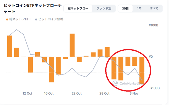 暗号資産情報サイトCoinMarketCapによれば、現物ETFは10月29日から5営業日連続で流出超を記録。11月4日には5.66億ドル流出し、5日間の合計で約19億ドル(2930億円)の資金が引き上げられました。その分のBTCが市場で売られたことにもなります。