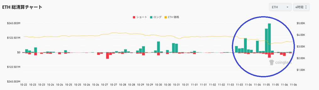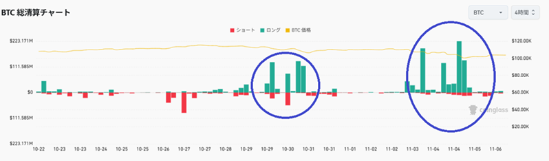 Coinglassの清算チャートによれば、先物ロングの清算(売り)は11月3-4日に多く見られます。現物市場の下げも、先物に引っ張られた形だったのでしょう。