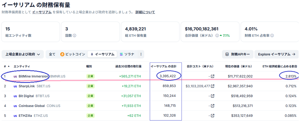 イーサリアム財務戦略を採用し、上場企業で最大のETH保有企業ビットマイン・イマージョン・テクノロジーが、含み損を抱えて動きが取れないとのニュースです。