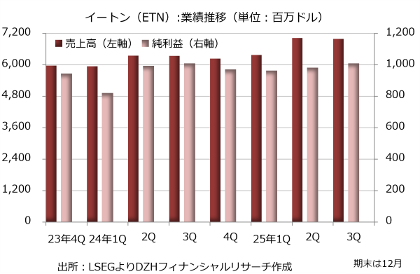 電力関連機器のイートン(ETN)が発表した2025年7-9月期決算は売上高が前年同期比10%増の69億8800万ドル、純利益が0.1%増の10億1000万ドルとなりました。調整後EPS(1株利益)は3.07ドルで、LSEGがまとめた市場予想の3.05ドルを0.7%上回っています。