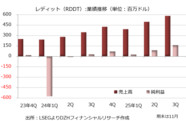 掲示板投稿型のソーシャルメディアを運営するレディット(RDDT)が発表した2025年7-9月期決算は売上高が前年同期比68%増の5億8500万ドル、純利益が5.4倍の1億6300万ドルとなりました。EPS(1株利益)は0.80ドルで、LSEGがまとめた市場予想の0.51ドルを56.9%上回っています。