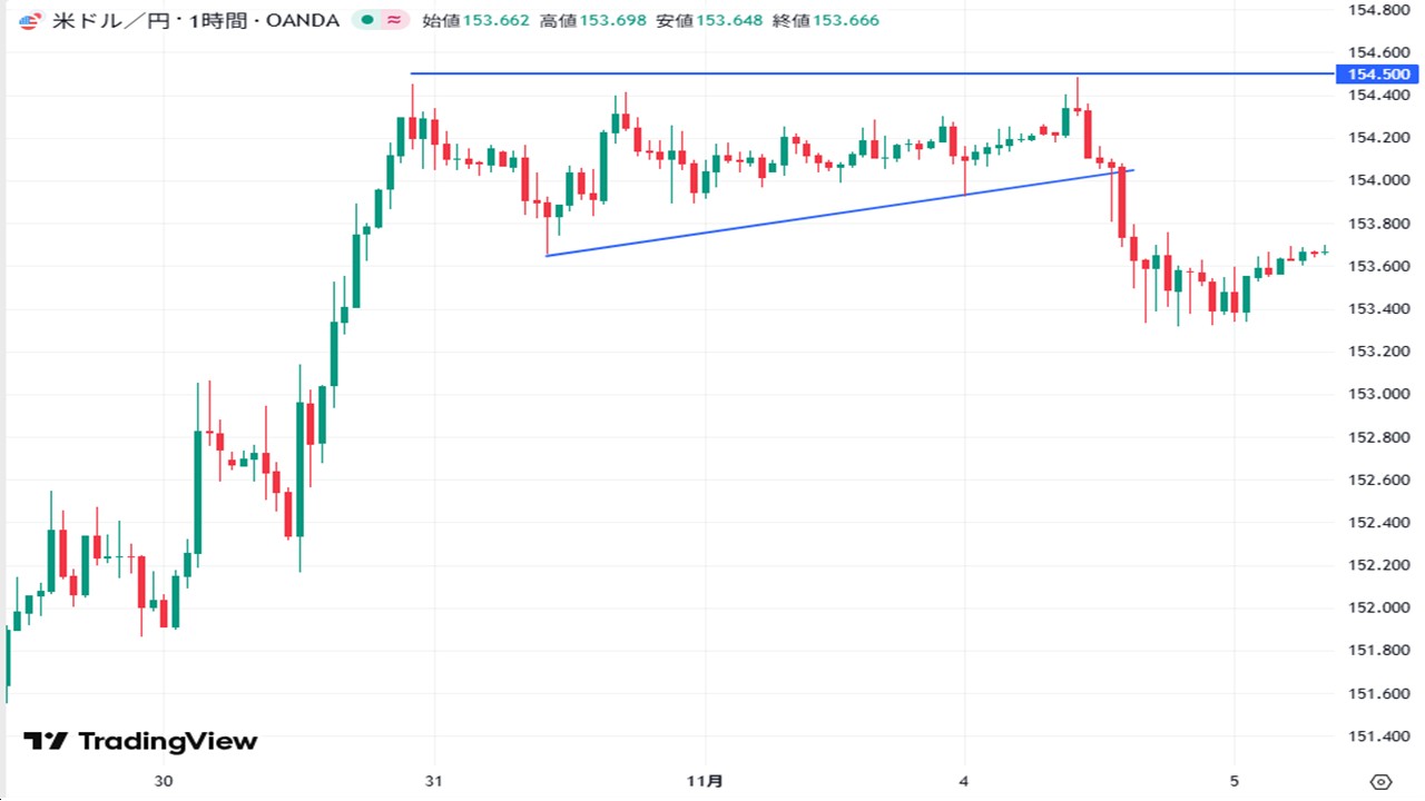 ちょうど60分足で、154.50円を上値抵抗、下値を切り上げるといった「アセンディングトライアングル」という強気の三角保合が出現していましたが、その保合を下抜けました。