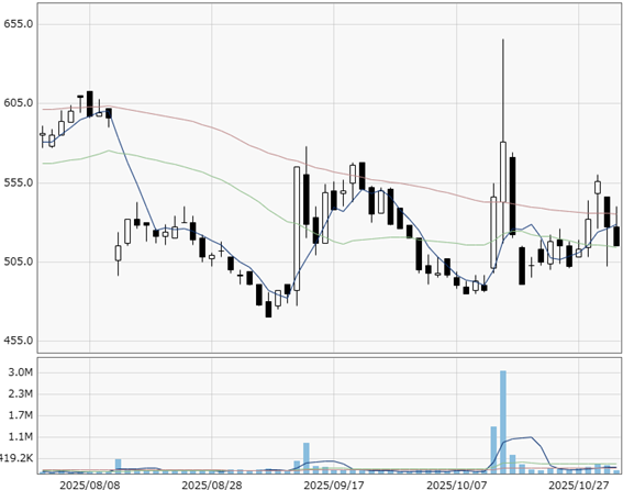 【イーディーピーの日足チャート(2025年8月31日から同10月31日まで)】