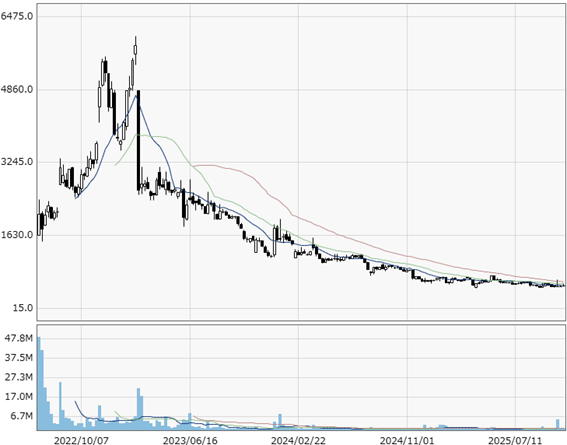 【イーディーピーの週足チャート(上場から2025年10月最終週まで)】