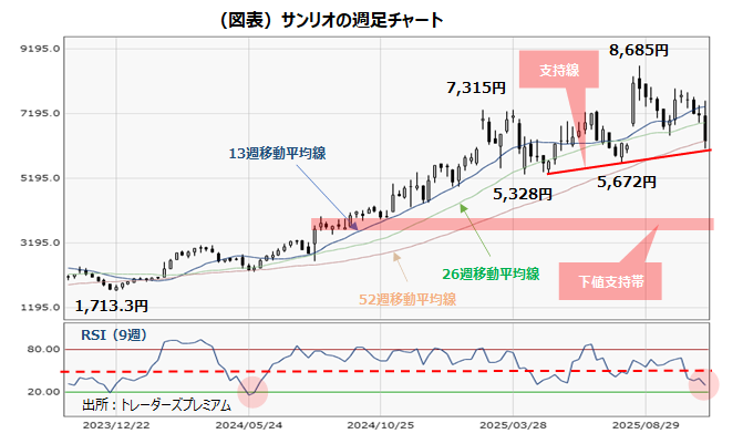 図表は、サンリオ(8136)の2023年11月頃からの週足のローソク足に加え、13週・26週・52週移動平均線です。下位は、売られ過ぎや買われ過ぎ、勢いなどをみるオシレータ系指標で代表的な相対力指数のRSI(9週ベース)の推移です。