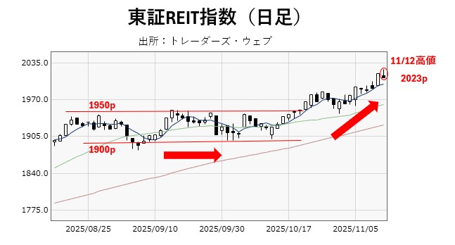 2025年11月10日に、東証REIT指数は節目の2000pを上回りました。この日は終値では下回ったものの、11日、12日は終値でも上回っており、12日は一度も2000pを割り込むことがありませんでした。