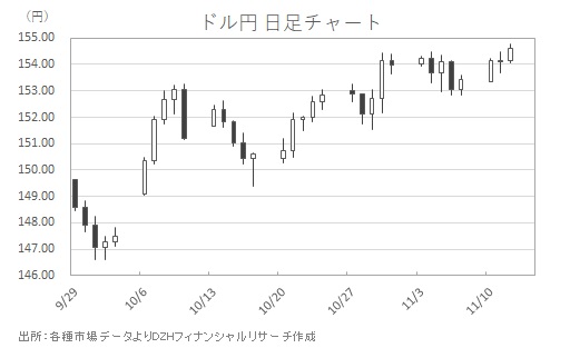 10月12日の東京タイム時点でドル円は2月4日以来、9カ月ぶりの155円回復をうかがう動きとなっています(図表参照)。同日、日経平均株価は寄り付き後に一時マイナスに転じたものの、円安が輸出関連株を下支えし、5万1000円台を回復する底堅さを示しました。