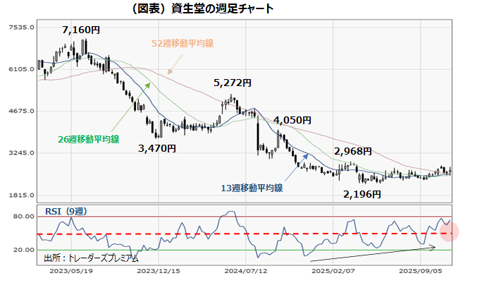 図表は、資生堂(4911)の2023年3月頃からの週足のローソク足に加え、13週・26週・52週移動平均線です。下位は、売られ過ぎや買われ過ぎ、勢いなどをみるオシレータ系指標で代表的な相対力指数のRSI(9週ベース)の推移です。