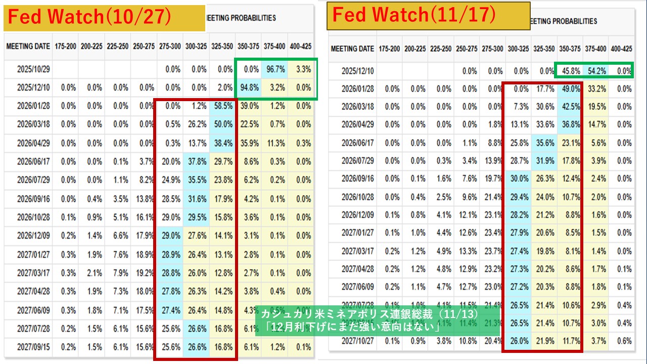 市場では、先週あたりから、12月FOMCでの米利下げに対する確率が急低下してきています!!