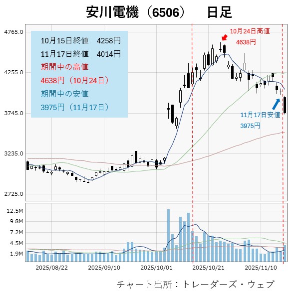 決算を材料に大きく上昇した後、AI関連の人気が高まる中で産業用ロボットを手がける同社もその一環との見方が強まり、市場からの評価が一段と高まりました。しかし、AI関連に高値警戒感が出てきたことで手じまい売りに押され、11月に入ると基調が下向きとなりました。期間中の安値は11月17日の3975円でした。この翌日18日には日経平均株価が4桁の下落となる中で大幅安となっています。