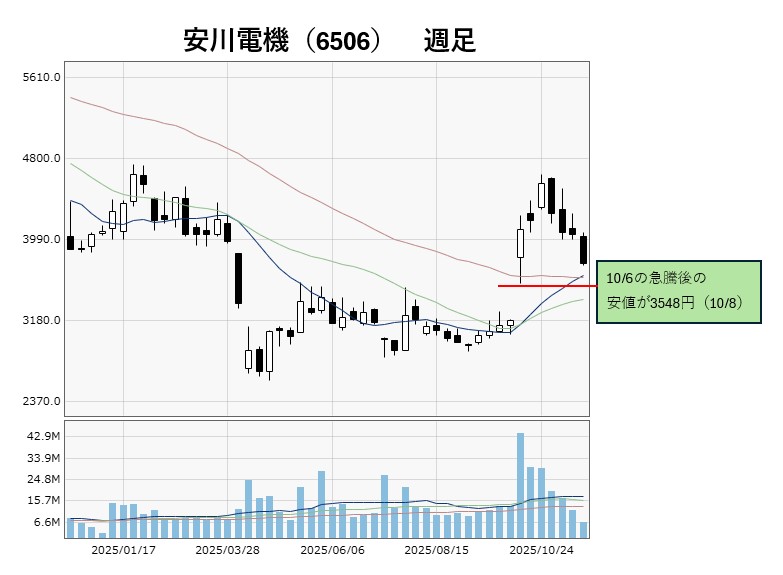 急騰後につけた安値は10月8日の3548円となります。これを下回ることなく反転できるかどうかが目先の注目点となります。