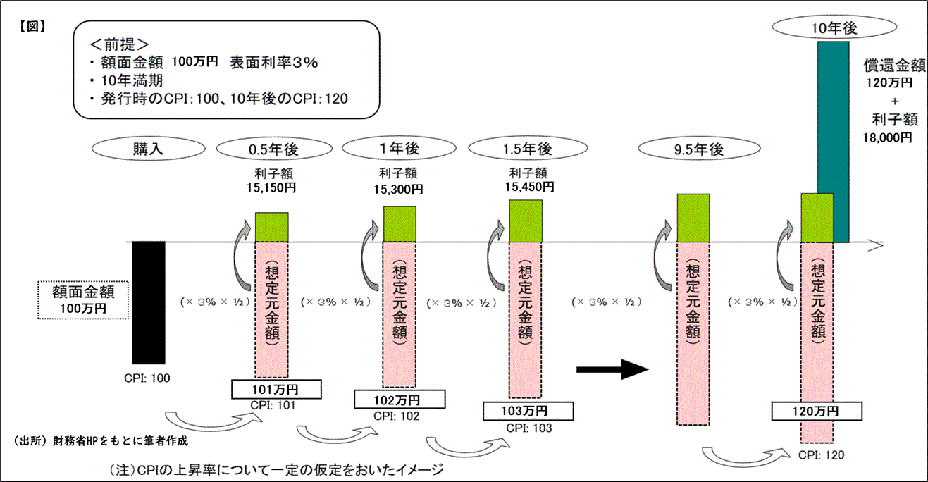 例えば、表面利率が3%の物価連動国債を100万円購入し、コアCPIが1%上昇した場合、想定元金額が101万円になり、半年分の利子は「101万円×3%×1/2(半年分のため)=15,150円(税引前)」となります。2%上昇した場合は「102万円×3%×1/2(半年分のため)=15,300円(税引前)」です【図】。