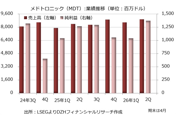 医療機器メーカーのメドトロニック(MDT)が発表した2025年8-10月期決算は売上高が前年同期比7%増の89億6100万ドル、純利益が8%増の13億7400万ドルでした。非GAAP(米国会計基準)の調整後EPS(1株利益)は1.36ドルで、LSEGがまとめた市場予想の1.315ドルを3.4%上回っています。