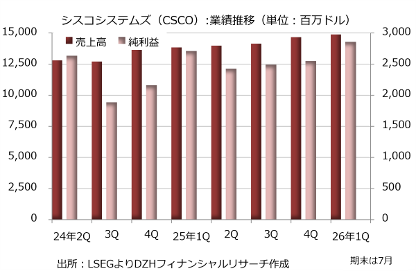 製品別の売上高ではネットワーク機器が15%増の77億6800万ドルと好調で、全体をけん引しました。人工知能(AI)をめぐる競争が加熱し、テック大手がデータセンター投資を積み上げる中、シスコシステムズもエヌビディア(NVDA)との提携を通じ、データセンターでのAI処理に適したスイッチを投入するなど、AIブームから恩恵を受ける取り組みを強化しています。