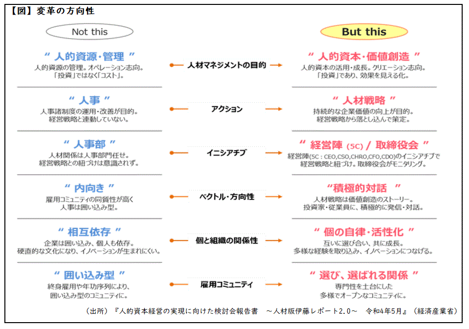 同年9月、研究会の成果として通称「人材版伊藤レポート」が公表されました。レポートには、今後のアクションの羅針盤となる変革の方向性が示されています【図】。