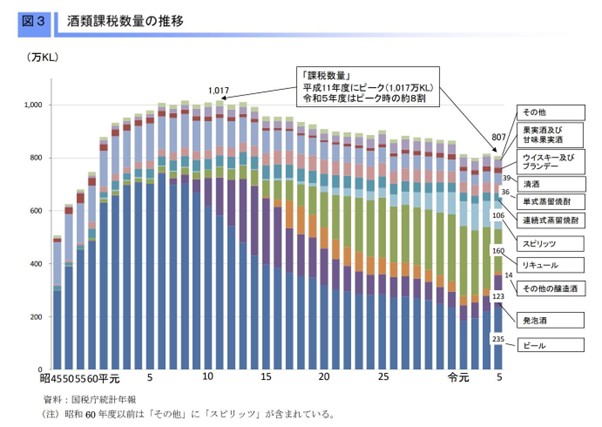 オリオンビールは今後どうなるのでしょうか。若者のアルコール離れに加え、以下のデータが示すように、国内の酒類市場全体が長期的な縮小傾向にあることは無視できない事実です。