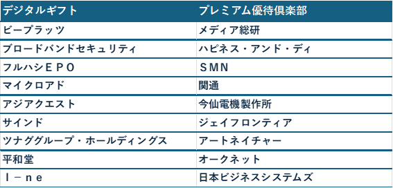 これに勝機を見出した上場企業もあり、株主優待のデジタルギフトを手掛けるデジタルプラス<3691>や、プレミアム優待倶楽部を手掛けるウィルズ<4482>のサービス導入が盛んです。今年、これらを導入した企業の一例を挙げてみるとこのようになりました。