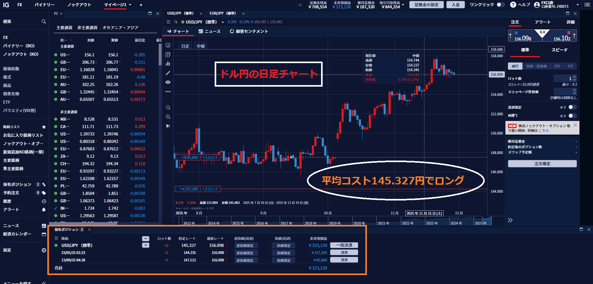 現在の私のポジションはドル円ロング@145.327円。日銀の利上げ観測や為替介入への警戒感が高まる中、今後は緩やかなペースで円安・ドル高が進むと想定し、現在のポジションを維持したいと思います。
