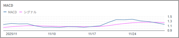 11月29日のドル円は、上記のチャートのように陰線のローソク足が目立っています。5日間の移動平均線(MA)を下回っているほか、下記のMACDからも、値下げ(為替の場合はドル売り)が進行していることが読み取れます。テクニカル分析で売買の目安とされる25日の移動平均線と、(ここには記載していませんが)前週より距離が近づいています。下落基調(=円高)にあるという証明です。