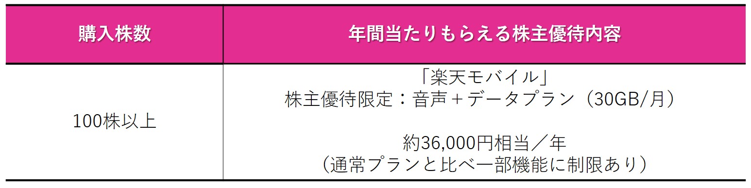 楽天グループの株主優待は、毎年12月末の権利確定日に、100株以上の株式を保有する株主に対して、楽天モバイルの「音声+データ30GBプラン」が1年間無料サービスが贈呈されます。