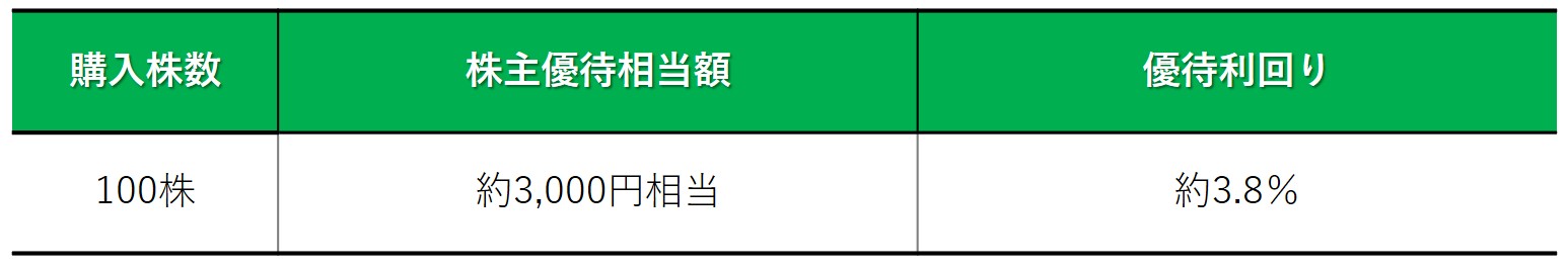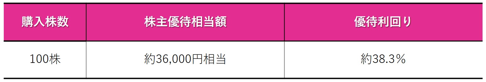 1株940円で100株購入した場合、投資金額は9.4万円です。配当金はありませんが、株主優待として年間約36000円相当のサービスが受けられるため、優待利回りは約38.3%になります。