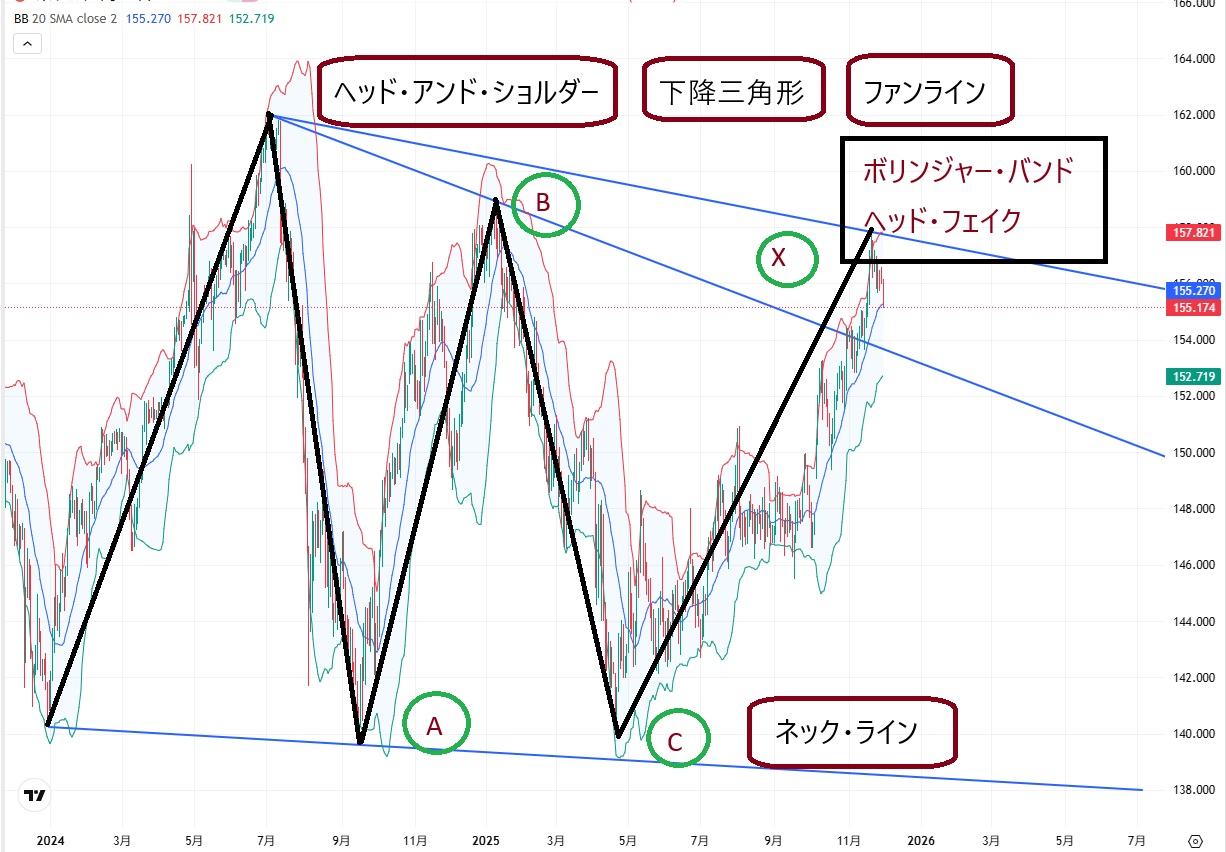 161.95円(2024/7/3高値)から158.87円(1/10高値)を経由する上値抵抗線を上辺、さらにファンラインを形成しつつ、ネック・ラインの140円前後を底辺とする「下降三角形」を形成中です。