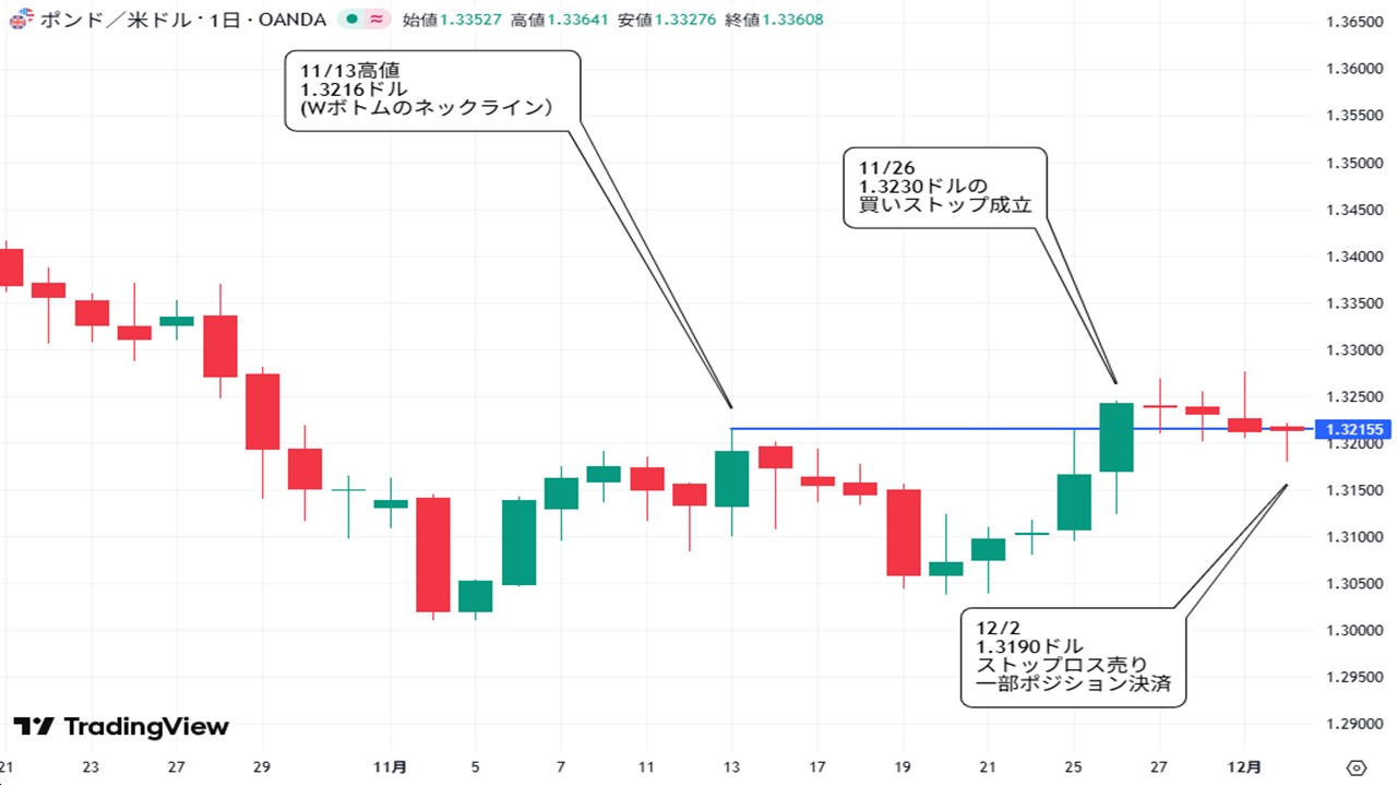今回は上抜けで買っていったということや、11月は通算でマイナスになってしまって相場観がさえないということもあり、安全策でストップを分散するという選択をしました。