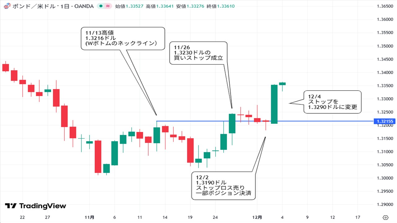 そこですかさず、ストップを1.3290ドルに引き上げたのは言うまでもありません。