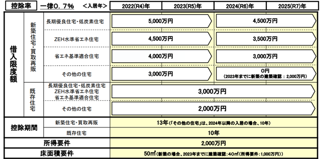 そもそも好景気であれば需要を喚起する減税策は必要ありません。こういった背景があるためか、より経済効果の大きい新築住宅かつ高性能である場合は借入限度額が最大4500万円までとなります。一方、省エネ基準を満たさない既存住宅(中古住宅)は2000万円までしか対象にならないため、上限との差は倍以上になります。