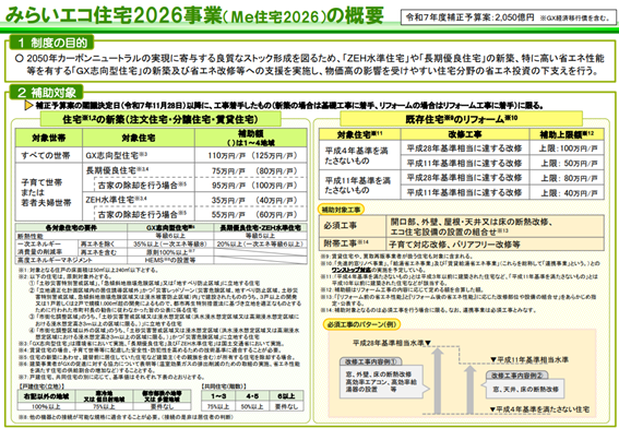 ただ、GX志向型住宅については110万円(寒冷地は125万円)に、長期優良住宅は75万円(従来は80万円)、ZEH水準住宅は35万円(従来は40万円)に減額となりました。リフォームは上限100万円(従来は60万円)なので、こちらは拡充です。前述した住宅ローン減税と合わせて、より中古住宅に目線を向けた政策といえます。