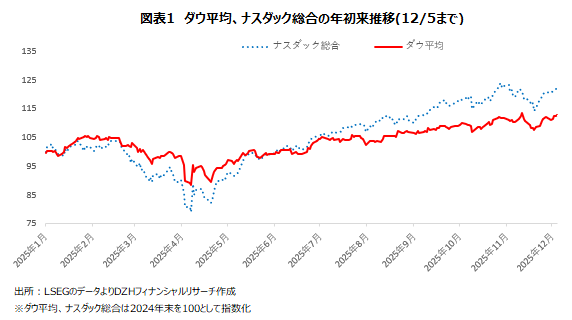 12月月初来ではダウ平均が0.50%高と8カ月続伸ペース、ナスダック総合が0.91%高と反発ペースとなり、年初来ではダウ平均が12.72%高、ナスダック総合が22.10%高となりました。