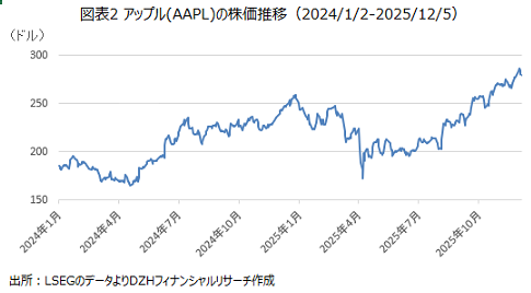 アップルはAIラリーが活況になる中、4月中旬以降の反発が限定的でしたが、足もとでエヌビディアやオラクルなどにバリュエーション懸念が強まる中、新型iPhoneの販売好調見通しを背景に上昇トレンドが復活しました。
