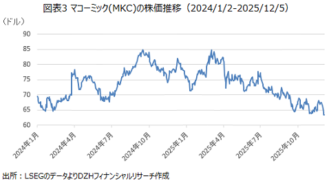 スパイス・調味料等製造のマコーミックは8月以降、トランプ関税による原材料コストの上昇懸念から52週安値の更新が続いていますが、業績は安定しています。
