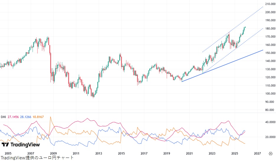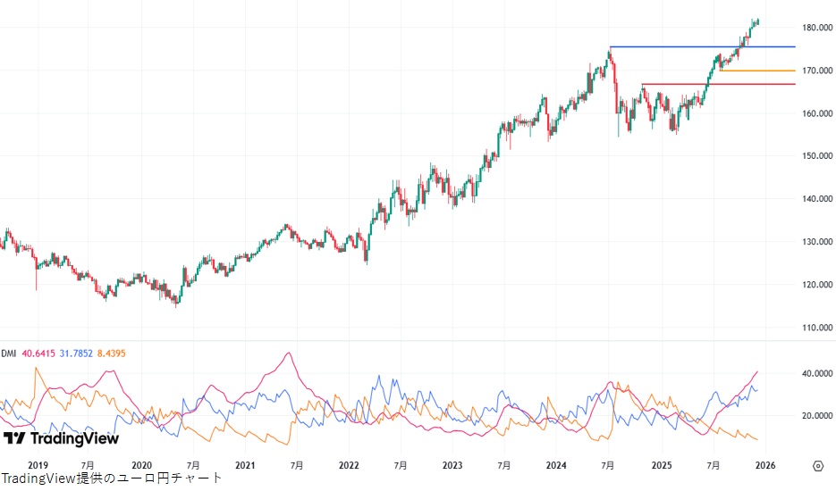 昨年7月につけた175.43円を上抜けて、足もとでは182円台までユーロ導入来の高値(史上最高値)を更新。チャート下部に追加した「DMI」で確認しても+DI>DI(上昇トレンド)、トレンドの強さを示すADXも急伸しており、現状がはっきりとした上昇トレンドであることが示されています。