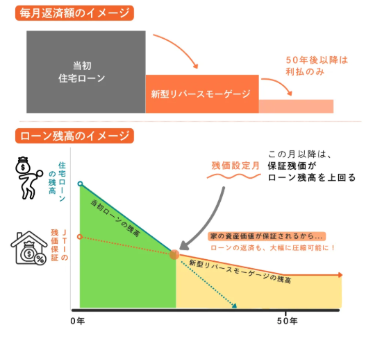 新型リバースモーゲージは、自宅を担保に入れてその後は元本の一部と利息を支払い、死亡時に一括返済する仕組みです。JTIが提供する残価設定型住宅ローンには「返済額軽減オプション」と「買取オプション」の2つがあり、前者は「JTIの保証する残価以上に原本を返さないことにより、月返済額が大幅に圧縮(返済額が3~4割に減少)」、後者は「住宅売却の際、ローン残高で家を買い取る」といったものになります。