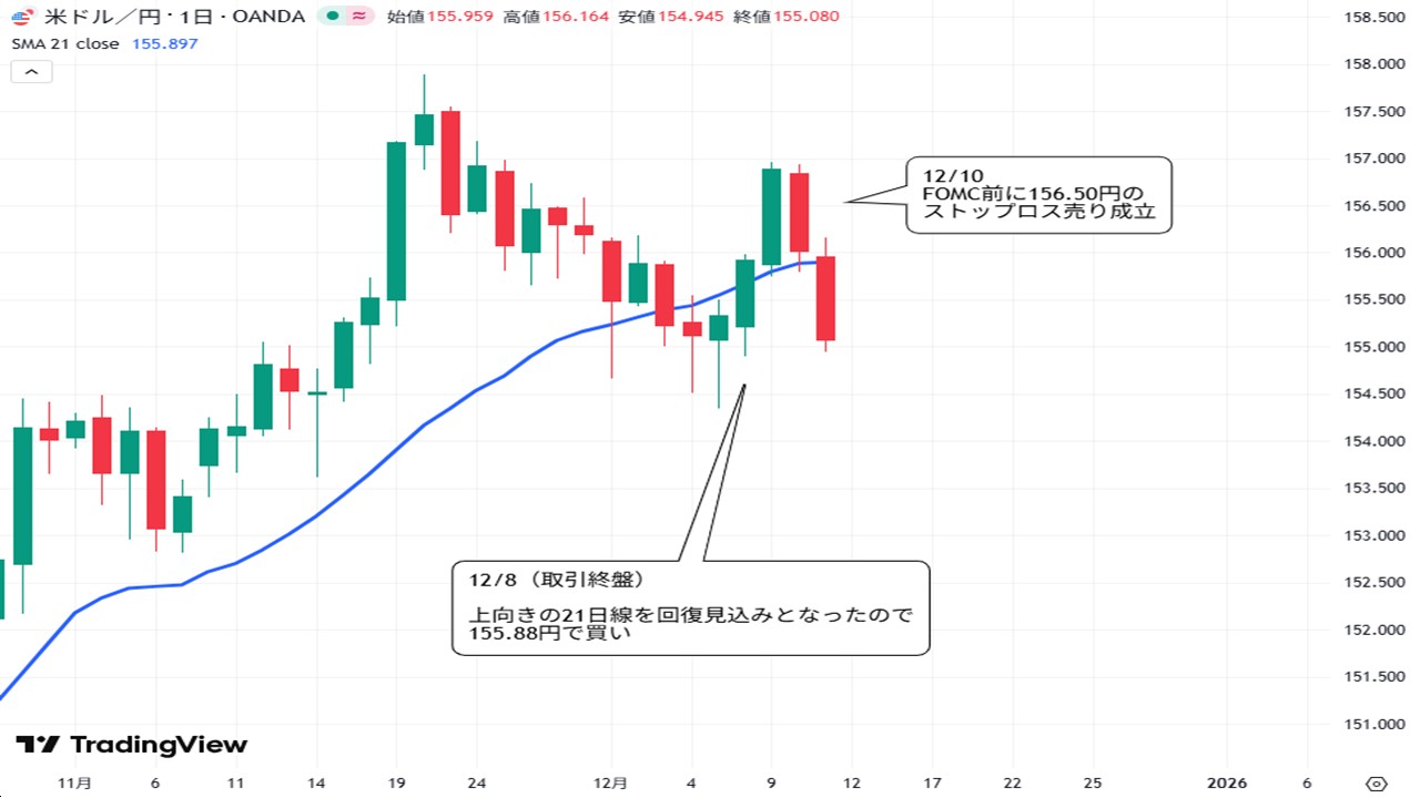 予想外だったのは、FOMC前にストップの156.50円に到達してしまった点です。利益確定だったとはいえもやもやする結果となりました。