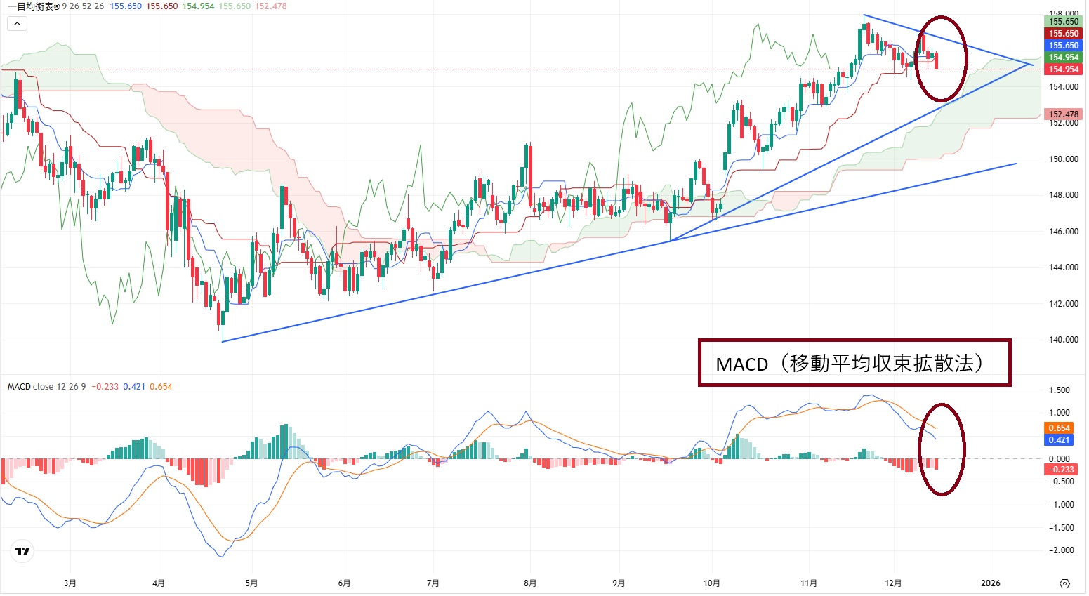 161.95円(2024/7/3高値)から158.87円(1/10高値)を経由する上値抵抗線を上辺、さらにファンライン(2)を形成しつつ、ネック・ラインの140円前後を底辺とする「下降三角形」を形成中です。