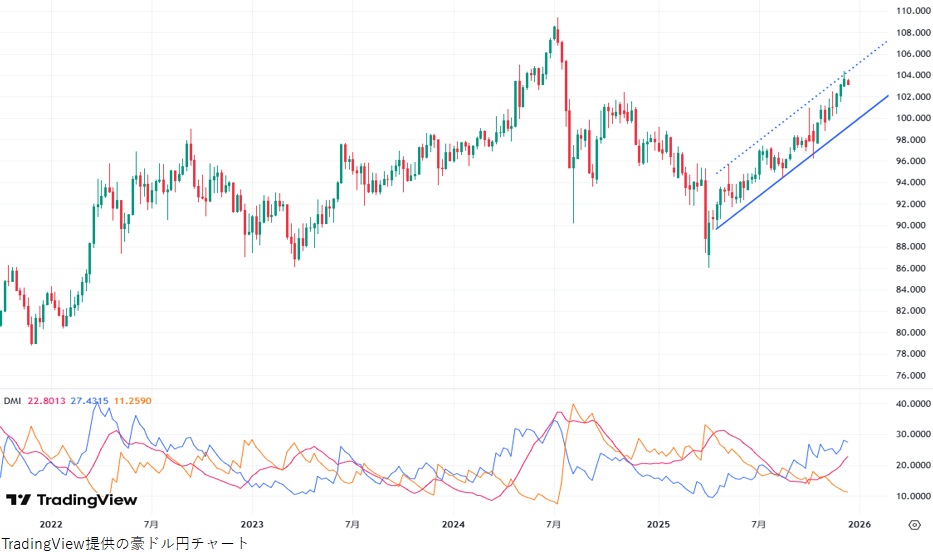 豪ドル円の週足分析:しっかりとした上昇トレンドを形成