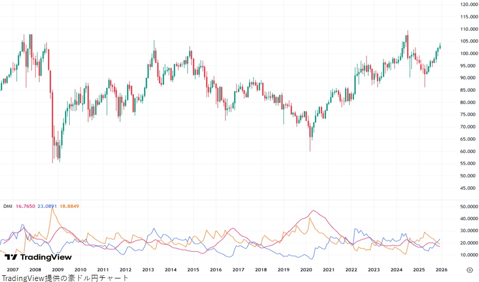 豪ドル円の月足分析:105-110円は2000年来のレジスタンスゾーン