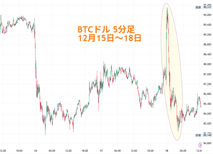 BTC相場は17日夜中(ニューヨーク序盤)に乱高下しました。米国勢が中心の時間帯ですので対ドルだけで話すと、23時45分に8万7200ドル前後をつけたところから、約20分後には9万0300ドル台まで急騰します。