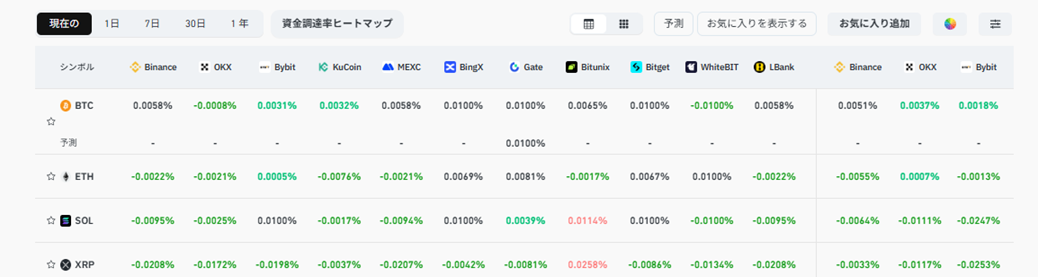 ファンディングは、永久先物の価格を現物に近づけるための調整料と言えるでしょう。ファンディングコストのプラスが続けば相場は買いに偏っている、マイナスが続くと売りに偏っているサインとされています。暗号資産分析サイトcoinglassなどで参照できます。